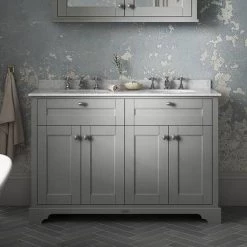 The Bayswater Pointing White 1200mm 4 Door Vanity Unit and Black Marble Double Bowl Basin Top will create a unique centre piece to any classic themed bathroom. It’s ample storage space provides plenty of room for bathroom essentials while the soft close doors limits the daily wear and tear and provides a quieter closing action. Made from high quality materials, it features side panelling for a classic look, elegant chrome knobs and a Bayswater logo plate that beautifully finishes the unit. The stunning black marble double bowl basin top contrasts beautifully with the classic white china basin.