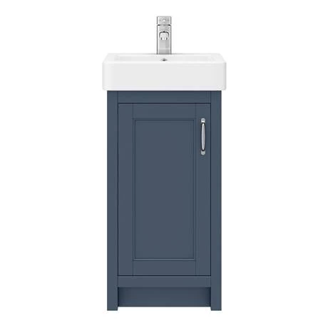 The Chatsworth traditional 425mm wide satin blue vanity unit with gloss white basin, Victorian inspired design with a modern twist. The Chatsworth range of charming bathroom furniture features classic styling with a satin blue finish cabinet and tongue-and-groove side panelling.