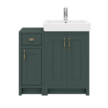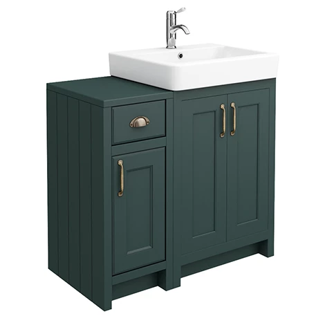 The Chatsworth traditional 560mm wide green vanity unit with a 300mm side cupboard unit, Victorian inspired design with a modern twist. The Chatsworth range of charming bathroom furniture features classic styling with a satin green finish cabinet and tongue-and-groove side panelling.