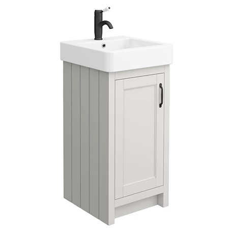 The Chatsworth traditional 425mm wide satin grey vanity unit with gloss white basin, Victorian inspired design with a modern twist. The Chatsworth range of charming bathroom furniture features classic styling with a satin grey finish cabinet and tongue-and-groove side panelling. The soft-closing door means no slamming and the cupboard boasts a sturdy matt black handle.