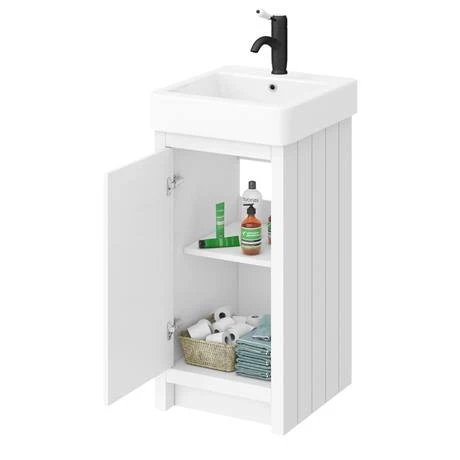 The Chatsworth traditional 425mm wide satin white vanity unit with gloss white basin, Victorian inspired design with a modern twist. The Chatsworth range of charming bathroom furniture features classic styling with a satin white finish cabinet and tongue-and-groove side panelling. The soft-closing door means no slamming and the cupboard boasts a sturdy matt black handle.