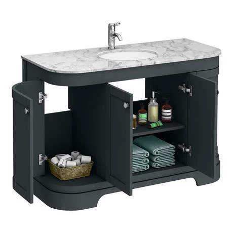 The Period Bathroom Company traditional 1220mm wide dark grey coloured curved vanity unit with white marble basin top; Victorian inspired design with a modern twist. The Period Bathroom Company range of charming bathroom furniture features a satin finish with clean lines and a recessed center panels for a classic look.Â