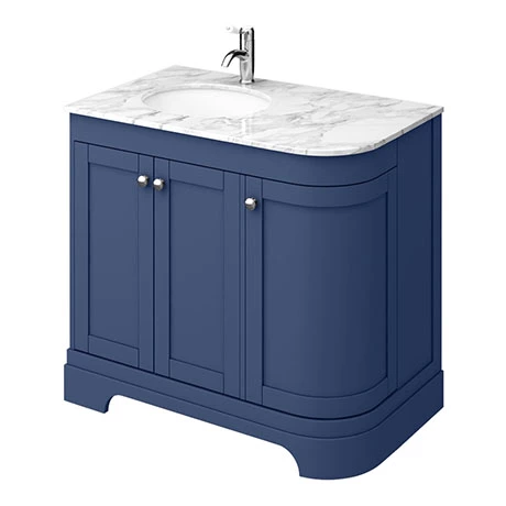 The Period Bathroom Company traditional 920mm wide Cobalt Blue coloured offset curved vanity unit with white marble basin top; Victorian inspired design with a modern twist. The Period Bathroom Company range of charming bathroom furniture features a satin finish with clean lines and a recessed center panels for a classic look.Â